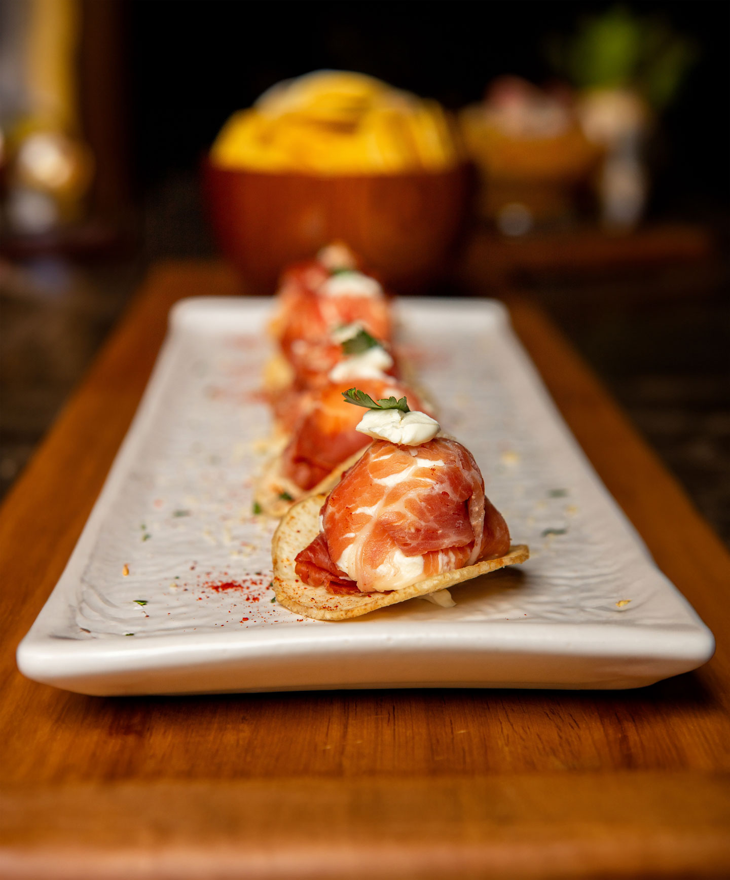 – Put each cream cheese ball over a cassava chip, sprinkle some paprika and place some parsley on top